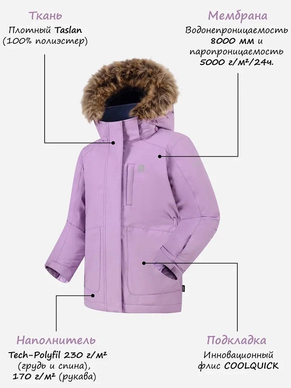 Зимняя парка GUSTI GW5GJ519-VIOLET - непромокаемая удлиненная куртка для девочек в лиловом цвете. Утеплитель 230 грамм, мембрана 8 000 мм. Изделие устойчиво к воздействию влаги и ветра. Паропроницаемость 5 000 мм. Через внешнюю часть изделия отлично циркулирует воздух, поэтому дети не потеют во время активных игр и занятий зимними видами спорта. Особенности: широкая ветрозащитная парка, клапан от зажимов кожи на уровне шеи, съемные капюшон и мех, регулируемые манжеты, эластичные вставки внутри рукавов с прорезью для большого пальца. В качестве подклада используется флис, на уровне талии расположена утяжка со стоппером.